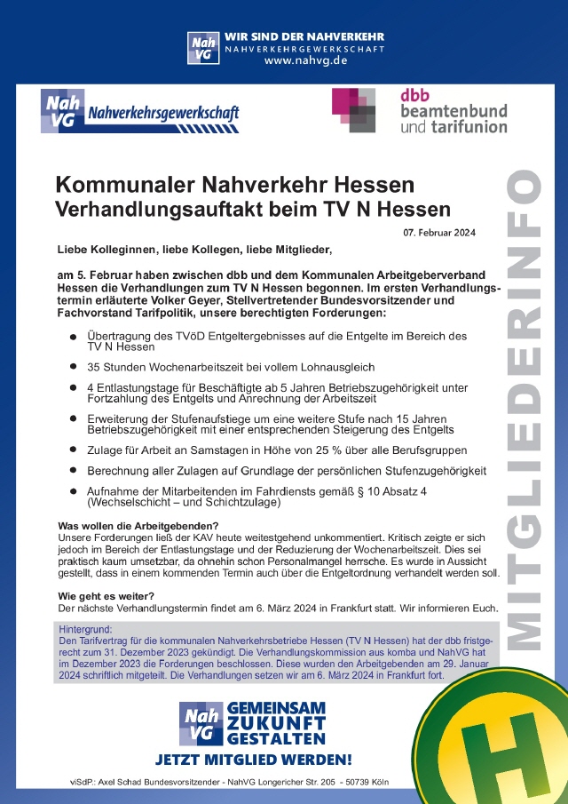 Am 5. Februar haben zwischen dbb und dem Kommunalen Arbeitgeberverband Hessen die Verhandlungen zum TV N Hessen begonnen. Im ersten Verhandlungstermin erläuterte Volker Geyer, Stellvertretender Bundesvorsitzender und Fachvorstand Tarifpolitik, unsere berechtigten Forderungen.
