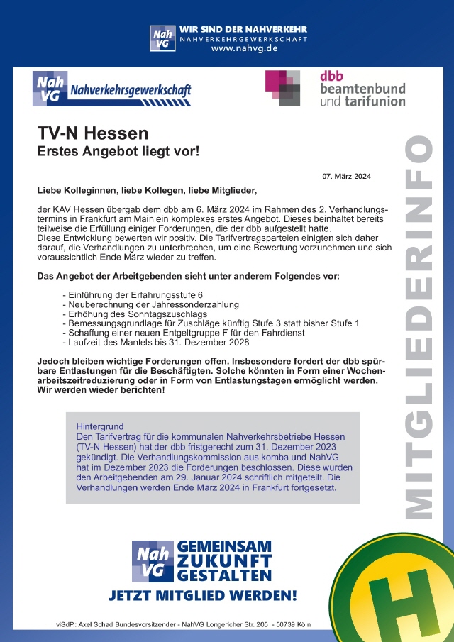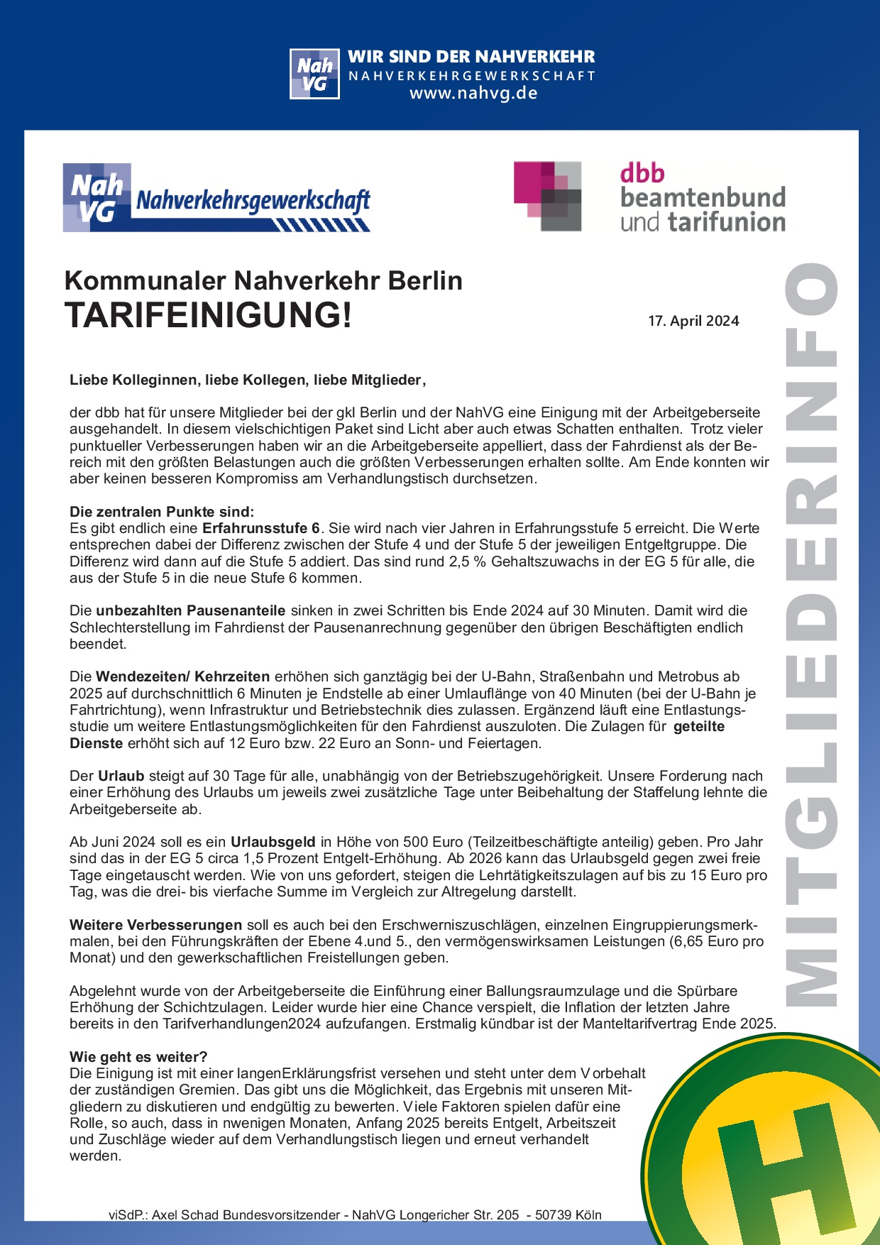 „Wichtig ist für uns ein Gesamtpaket aus Entlastung und weiteren finanziellen Verbesserungen“, bewertete Andreas Hemsing Verhandlungsführer des dbb das Ergebnis. „Mit bis zu vier echten Entlastungstagen und den Schichtzuschlägen mindestens auf Basis der Stufe 4 gehen wir gerade in den Bereichen Fahrdienst und Werkstatt einen wichtigen Schritt Richtung Zukunft und Aufwertung“, so Hemsing weiter. Abgewehrt wurden alle Arbeitgebervorstellungen zu Kürzungen bei der Entgeltfortzahlung oder Möglichkeiten zur Ausdehnung von freiwilligen Arbeitszeiten.