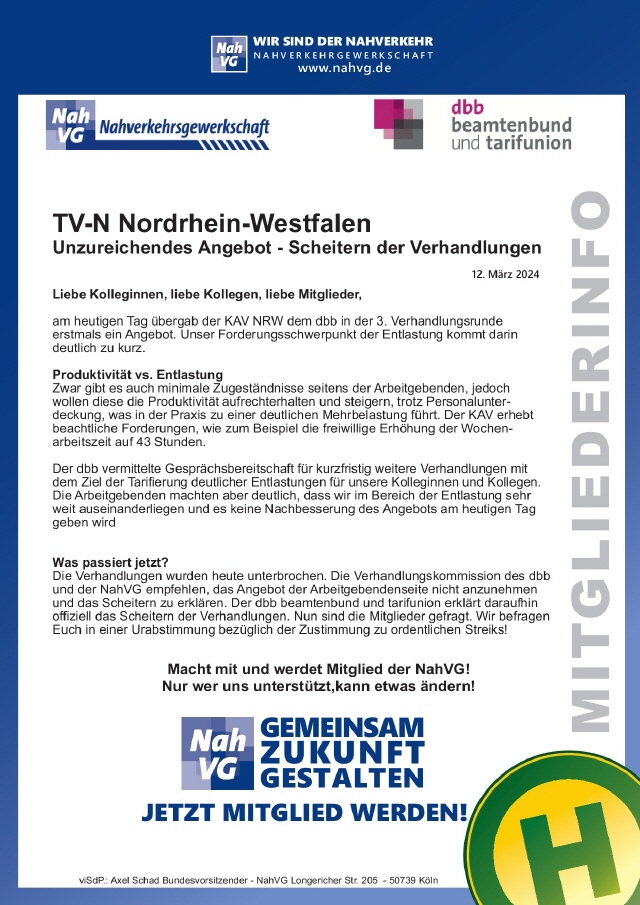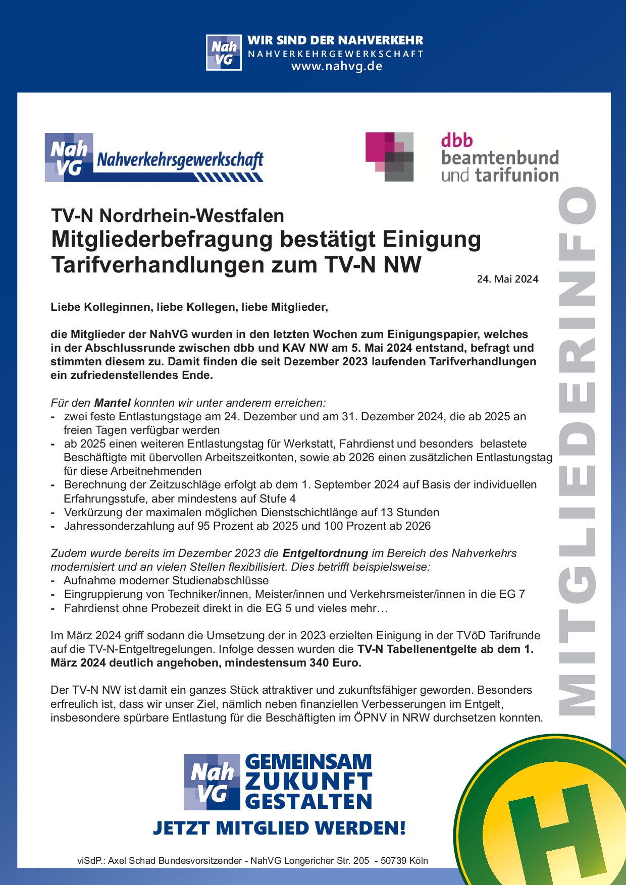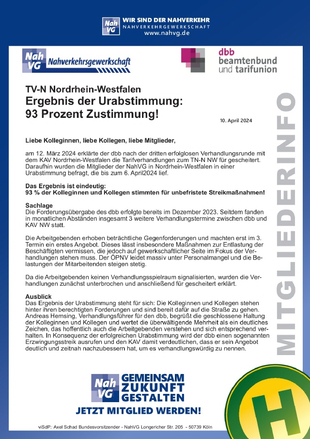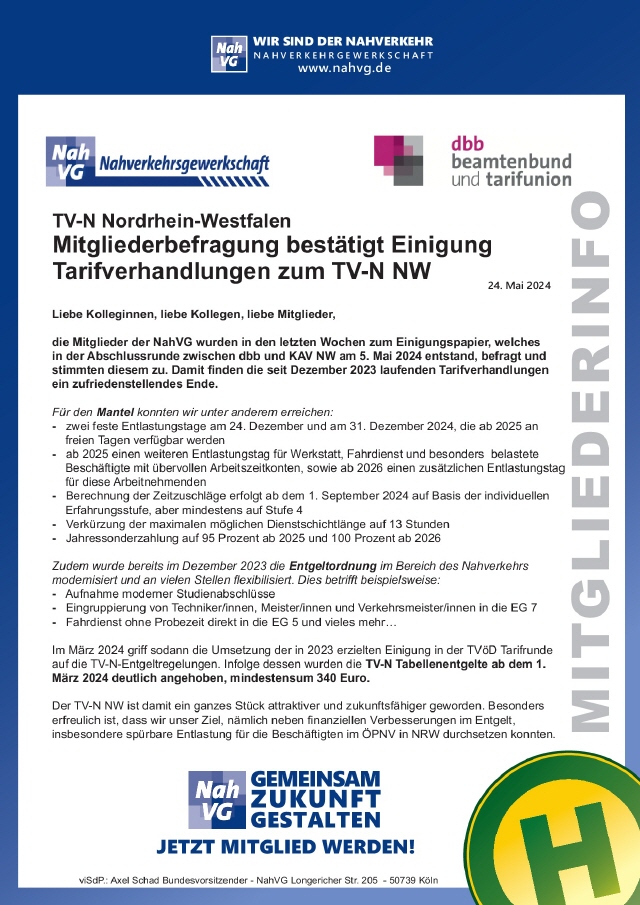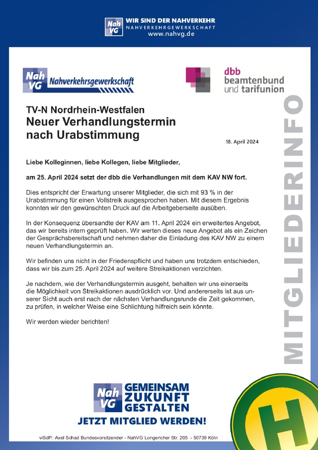 Die Mitglieder der NahVG wurden in den letzten Wochen zum Einigungspapier, welches in der Abschlussrunde zwischen dbb und KAV NW am 5. Mai 2024 entstand, befragt und stimmten diesem zu. Damit finden die seit Dezember 2023 laufenden Tarifverhandlungen ein zufriedenstellendes Ende.