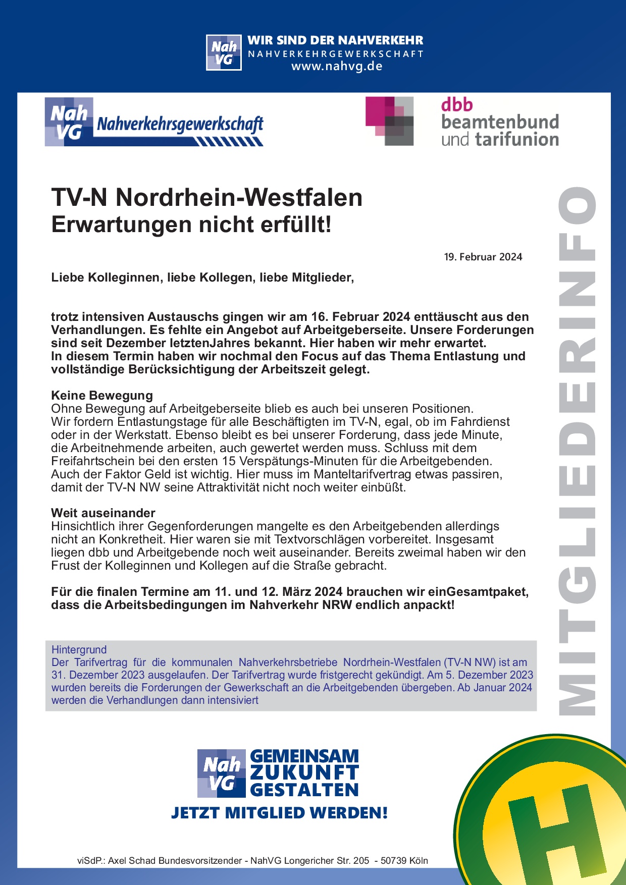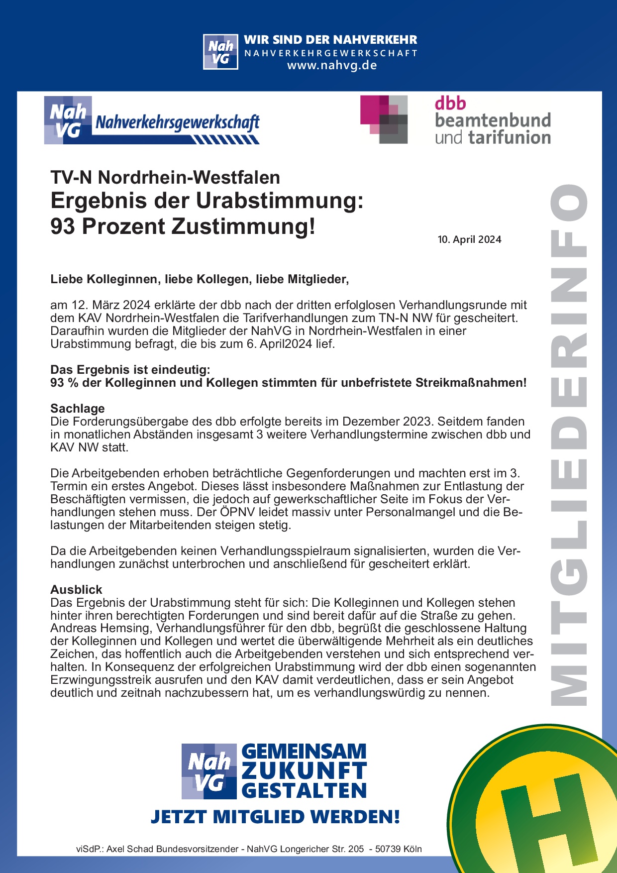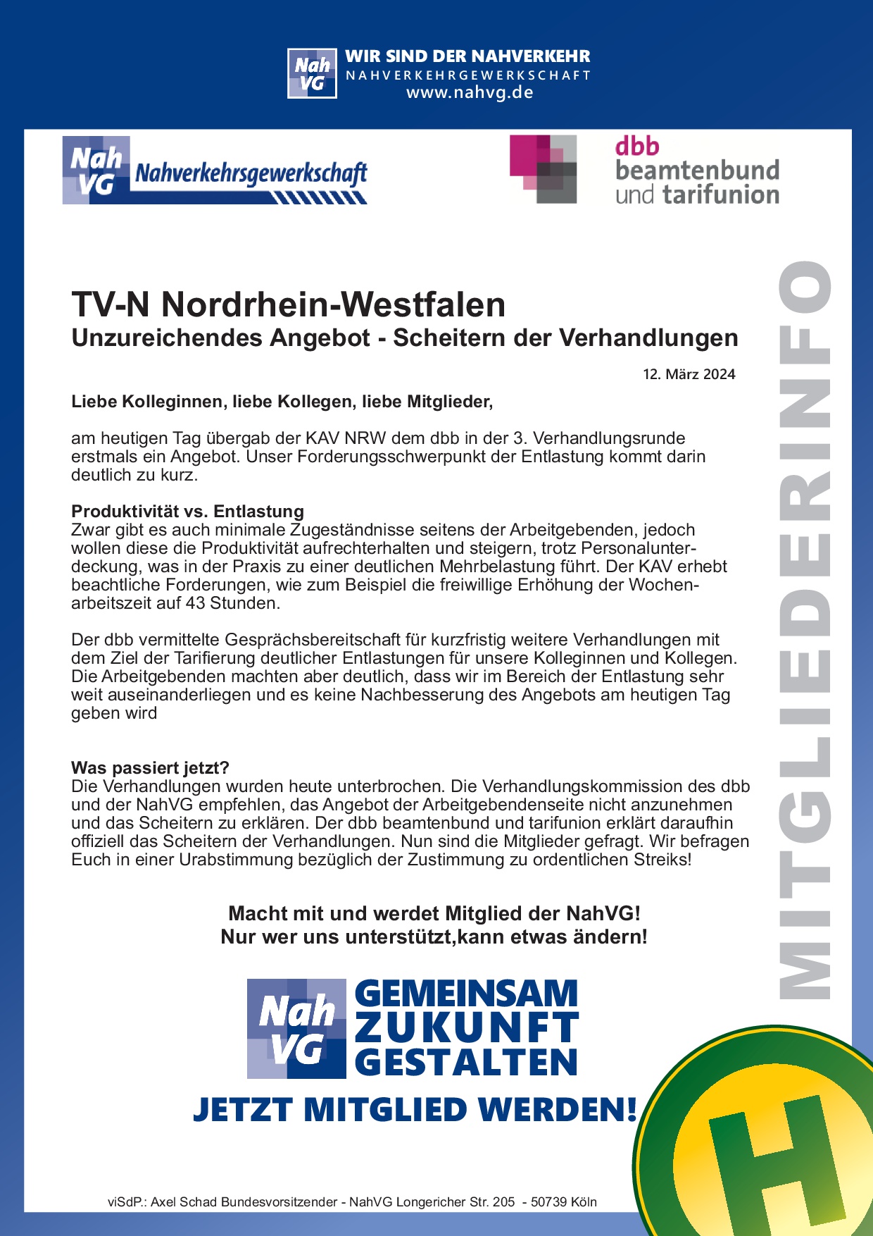 Die Mitglieder der NahVG wurden in den letzten Wochen zum Einigungspapier, welches in der Abschlussrunde zwischen dbb und KAV NW am 5. Mai 2024 entstand, befragt und stimmten diesem zu. Damit finden die seit Dezember 2023 laufenden Tarifverhandlungen ein zufriedenstellendes Ende.
