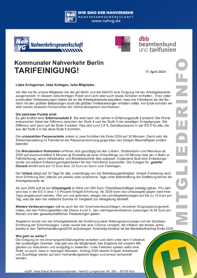 Der dbb hat für unsere Mitglieder bei der gkl Berlin und der NahVG eine Einigung mit der Arbeitgeberseite ausgehandelt. In diesem vielschichtigen Paket sind Licht aber auch etwas Schatten enthalten. Trotz vieler punktueller Verbesserungen haben wir an die Arbeitgeberseite appelliert, dass der Fahrdienst als der Bereich mit den größten Belastungen auch die größten Verbesserungen erhalten sollte. Am Ende konnten wir aber keinen besseren Kompromiss am Verhandlungstisch durchsetzen.