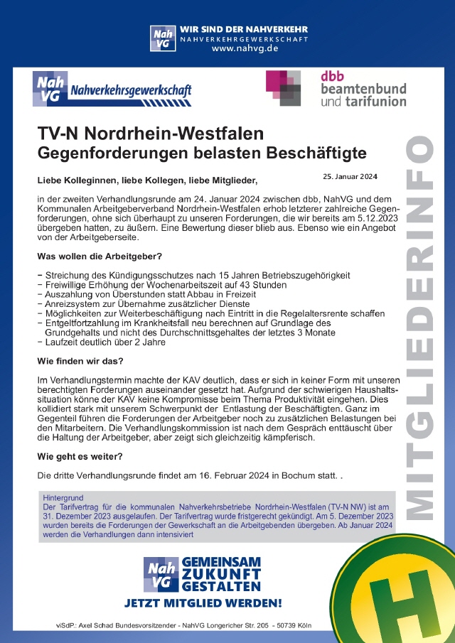 In der zweiten Verhandlungsrunde am 24. Januar 2024 zwischen dbb, NahVG und dem kommunalen Arbeitgeberverband Nordrhein-Westfalen erhob letzterer zahlreiche Gegenforderungen, ohne sich überhaupt zu unseren Forderungen, die wir bereits am 5. Dezember 2023 übergeben hatten, zu äußern. Eine Bewertung dieser blieb aus. Ebenso wie ein Angebot von der Arbeitgeberseite.
