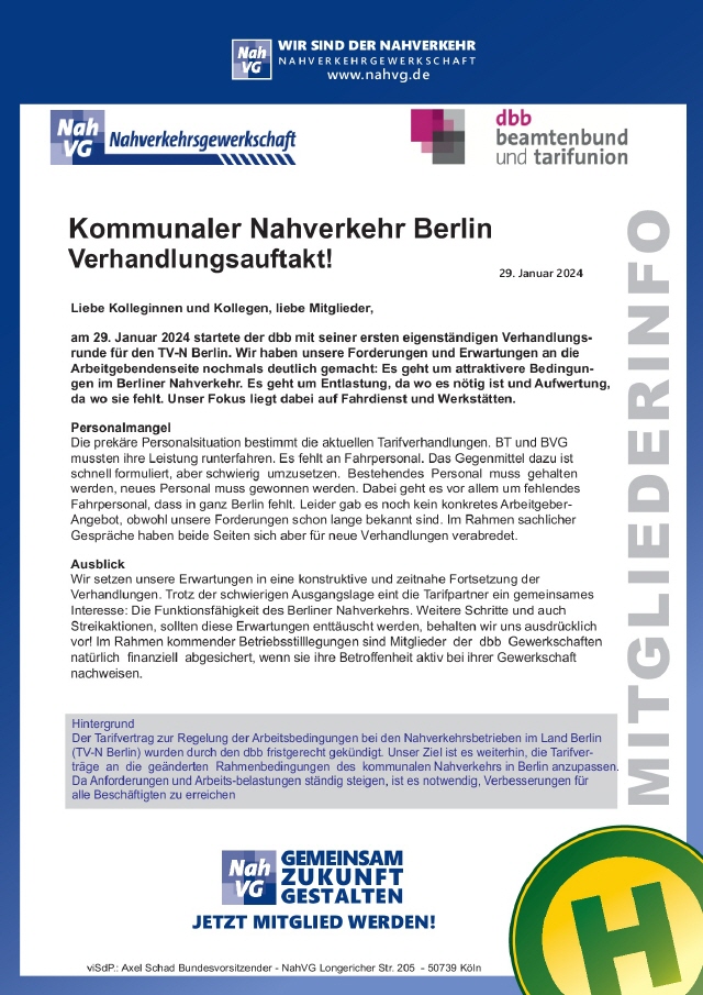Am 29. Januar 2024 startete der dbb mit seiner ersten eigenständigen Verhandlungsrunde für den TV-N Berlin. Wir haben unsere Forderungen und Erwartungen an die Arbeitgebendenseite nochmals deutlich gemacht: Es geht um attraktivere Bedingungen im Berliner Nahverkehr. Es geht um Entlastung, da wo es nötig ist und Aufwertung, da wo sie fehlt. Unser Fokus liegt dabei auf Fahrdienst und Werkstätten.